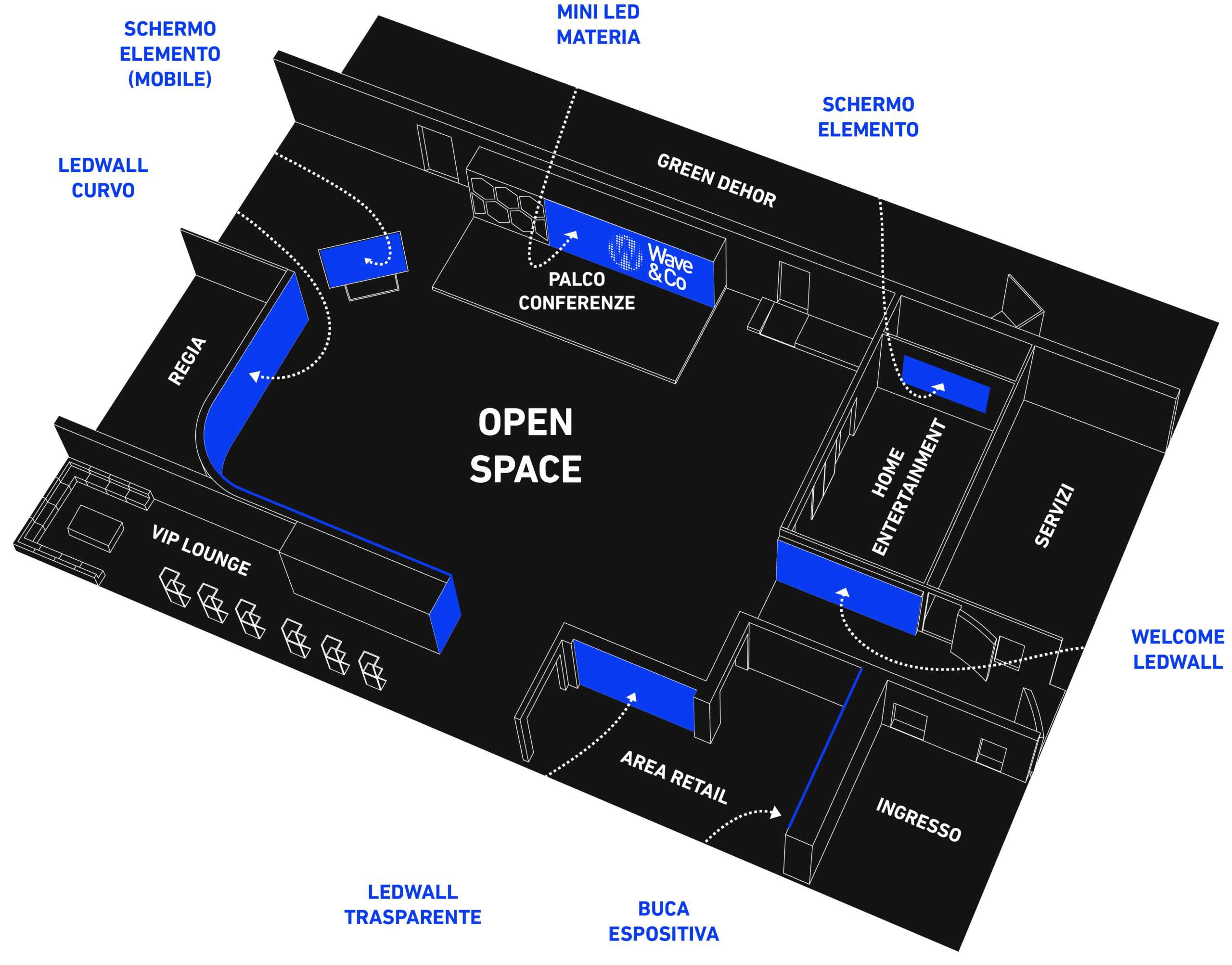 - 150 mq di schermi led di ultimissima concezione, curvi, trasparenti, 4k e personalizzabili;
