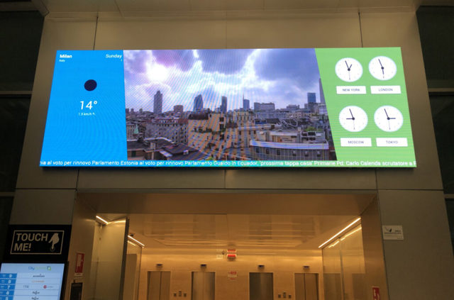 Nel prestigioso complesso di uffici CBRE, a Milano, uno schermo led A-series Indoor 2.9mm, dona vita e luce all’ingresso, mostra dati riguardanti gli uffici e I piani e, all’occorrenza, mostra comunicazioni rilevanti e previsioni meteo.
